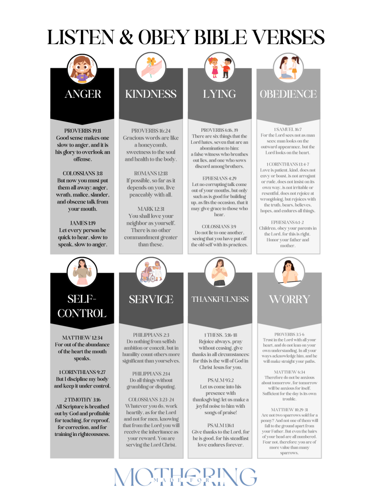 You know there’s a Bible verse for that, but you are mid-discipline with your toddler and just cannot recall it. Enter the Listen & Obey chart!
